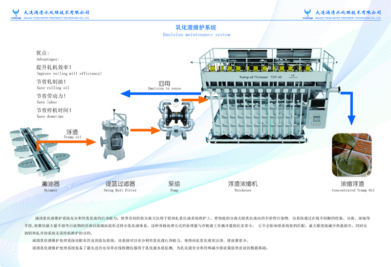 涌清乳化液维护系统充分利用乳化液的自净能力,世界首创的将分离方法用于铝热轧乳化液系统维护系统上,更彻底的分离去除乳化液内的不溶性污染物。该系统通过在线不间断的收集、分离、浓缩等手段,将聚结最大量不溶性污染物的浮渣以浓缩的油泥形式排出乳化液体系,这种旁路处理形式的处理量与冷脱液工作循环相比非常小。 它不会影响原系统泵的匹配,最大限度地减少热量损失。同时达到铝热轧冷却系统无需停机维护的目的。